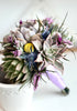 "Succulent bouquet featuring a mix of echeverias, yellow Craspedia (Billy Balls), lavender statice, and purple thistle. The handle is wrapped in lavender satin ribbon, which can be customized to match your wedding colors."